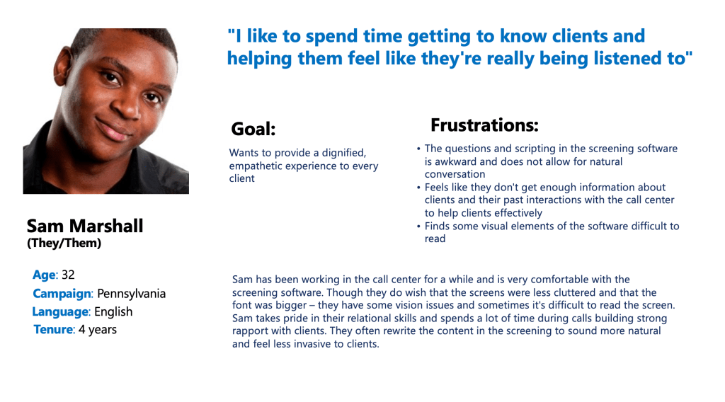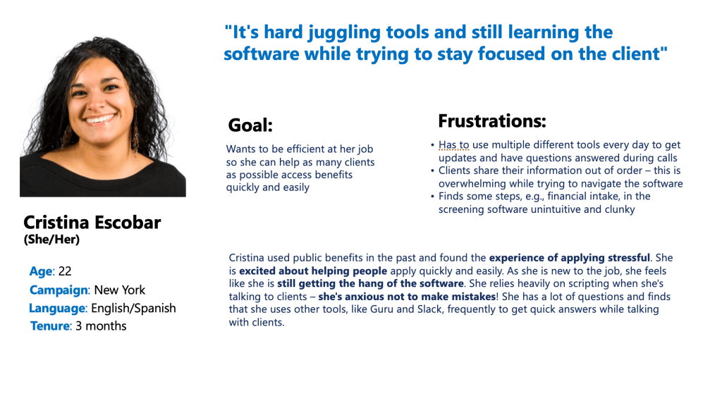 The software was outdated, inefficient, and not user-friendly, leading to expensive staff training and time-consuming workarounds. The team decided to build new software that would be efficient, user-friendly, and scalable. I wanted the users, the support center agents, to provide substantial input into the development process to ensure the software met their needs. With this in mind, I decided on a continuous discovery approach.