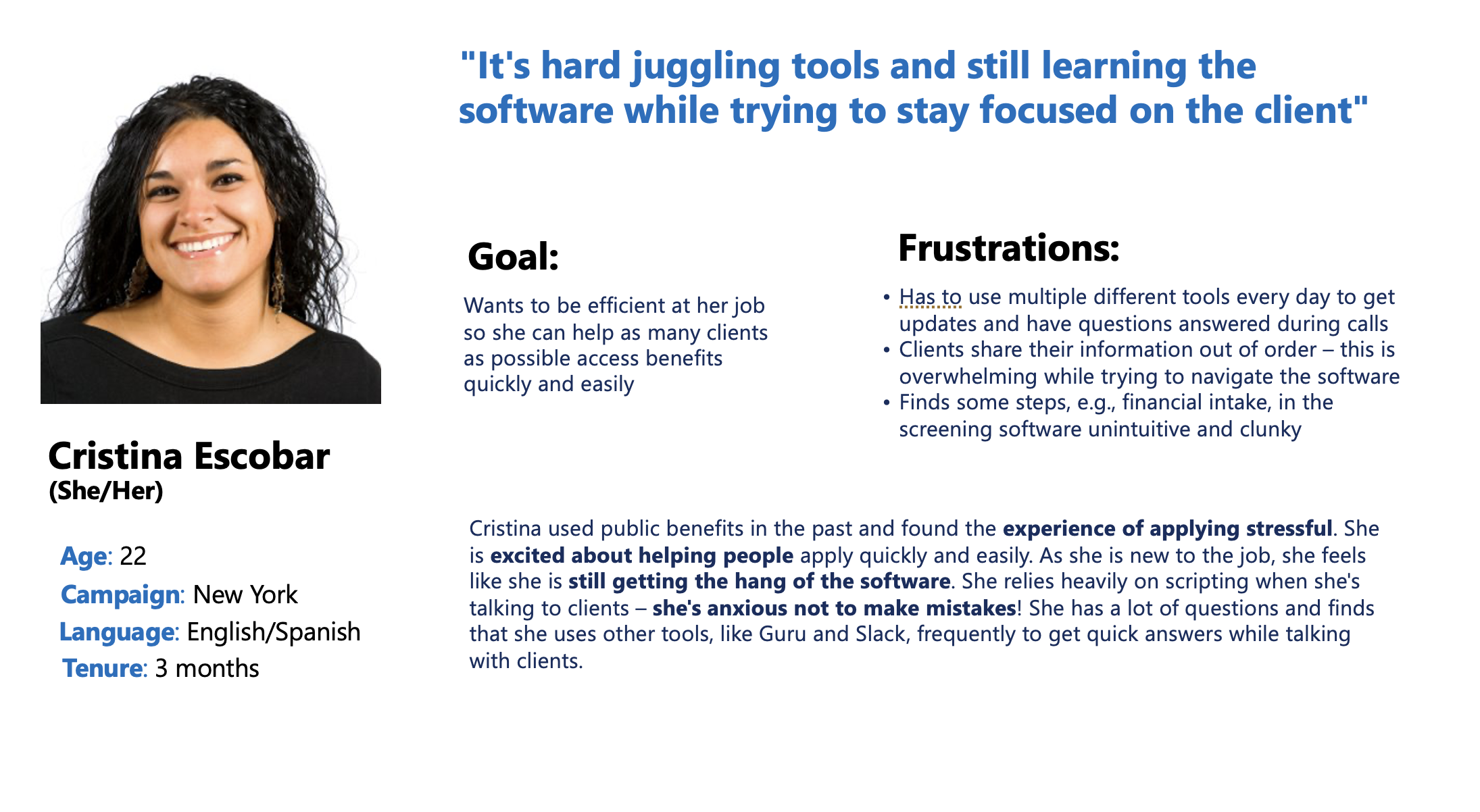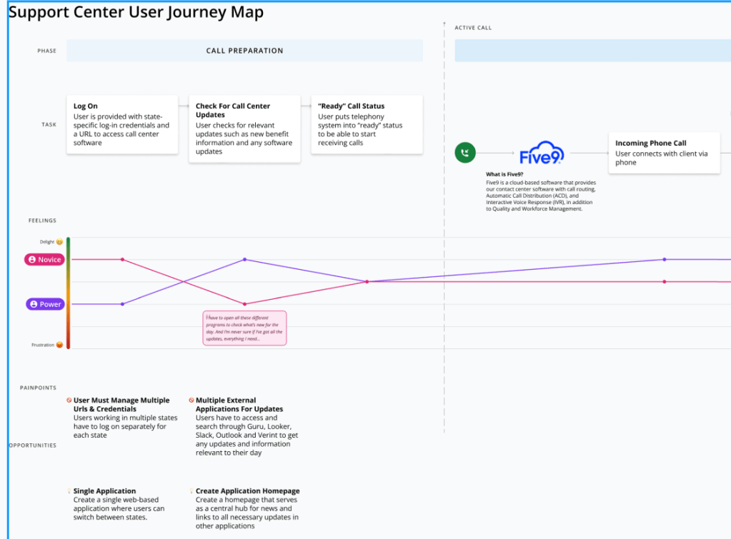 Foundational/discovery research: Understand support center agents’ experiences with the current software and map their journey highlighting pain points and opportunities.